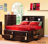 Dayton Storage Chest King Bed - Coaster 200409KEThe Coaster Dayton Storage ChestKing Bedis made from solid hardwoods and maple veneers for a sturdy construction.It is finished in polished rich deep cappuccino. All the drawers have beveled fronts and are accented with brushed nickel finish.The added luxury of having storage drawers under the bed (6 drawers) is quite ingenious as well as a storage (2 small drawers and 2 shelves) bookcase headboard. ThisKing Bedfrom Coaster ships at no additional charge in the continental US. Features:Storage Drawers under BedStorage Bookcase HeadboardSolid Hardwoods and Maple VeneersSmooth Cappucino FinishDrawers Have Metal GlidesBrushed NickelHardwareThe Coaster Dayton Bed Dimensions:King - (Coaster Model #200409KE) 93L x 78"W x 56"H (bed platform height 24")Some assembly requiredFinish:Deep Cappuccino"