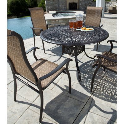 Features48 inch Round Kaleidoscope Dining Table with 4 Sling Stackable Dining Arm Chairs, Table includes an umbrella hole100% Cast Aluminum, No Rusting to Worry About, Chairs are fully assembled and stack for easy storageSling Chairs are Quick Dry and do not absorb water.High Quality Powder coated frameTable: 48" L x 48" W x 29" H; Chairs: 26" L x 29" W x 44" H Alfresco Home Charter Cast Aluminum 4-Seat Dining Set?