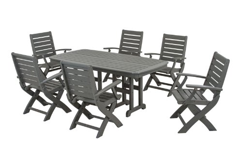 FeaturesIncludes six arm chairs, one table, hardware pack and assembly toolsRectangular tableChair folds for easy storage and transportationEco-friendly production with over 90% recycled materials lumberSolid, heavy-duty construction withstands natures elements Signature 7-Pc Dining Set in Slate Gray?