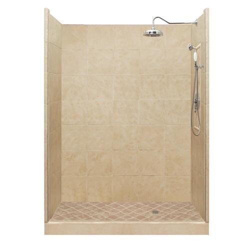Premium Single Threshold Shower Base and Shower Wall Size: 60" L x 30" W x 86" H, All Hardware: Chrome, Drain / Faucet: Right / Right?P21-2704P-CH Size: 60" L x 30" W x 86" H, All Hardware: Chrome, Drain / Faucet: Right / Right Pictured in Chrome Features: -Single threshold.-A great weekend project instead of weeks.-Easy to install and save thousands of dollars compared to installing a conventional stone shower.-Hand crafted Sistine stone - a quartz and polymer blend with travertine look and feel.-Reinforced and leak-free shower pan and walls.-Non-porous, easy to clean, stain, mold, and mildew resistant.-Enjoy a 5-star resort shower in your home. Color/Finish: -Pressure balanced valve, large pan showerhead, hand shower, and drain in Chrome finish. Dimensions: -12''x12'' wall tiles with inlaid 4''x4'' diagonal pattern. Collection: -Premium collection. Warranty: -Manufacturer provides 10 year limited warranty.