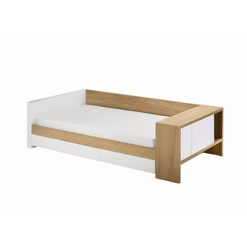 Nurseryworks Duet Twin Bed with Trundle in Light Wood with Snow Cabinets?Realize your childs perfect sleep solution with Duet Twin Bedthe modern twin bedFeatures include:Choose between three under-bed drawers or trundle bed with custom mattressOne sliding cabinetchoose between 3 cabinet door colorsPackaging made from recycled cardboard