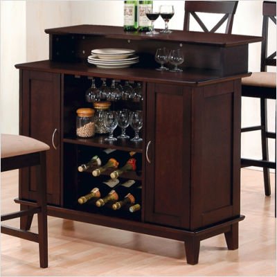 #[***INCLUDED IN THIS SET: (1)Derby Bar in Deep Cappuccino, (2)Derby 30" Bar Stool in Deep Cappuccino] Features: -Contemporary style.-Smooth tops with smooth edges.-Simple silver hardware.-Square tapered legs, smooth edges, clean lines. Includes: -Set includes bar table and bar stool. Construction: -Constructed of hardwood solids and veneers. Color/Finish: -Deep cappuccino finish. Dimensions: -Bar Table: 42'' H x 47'' W x 25'' D.-Bar Stool: 47'' H x 17'' W x 20'' D.